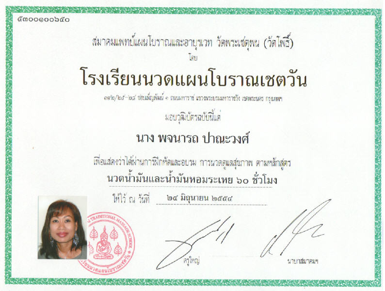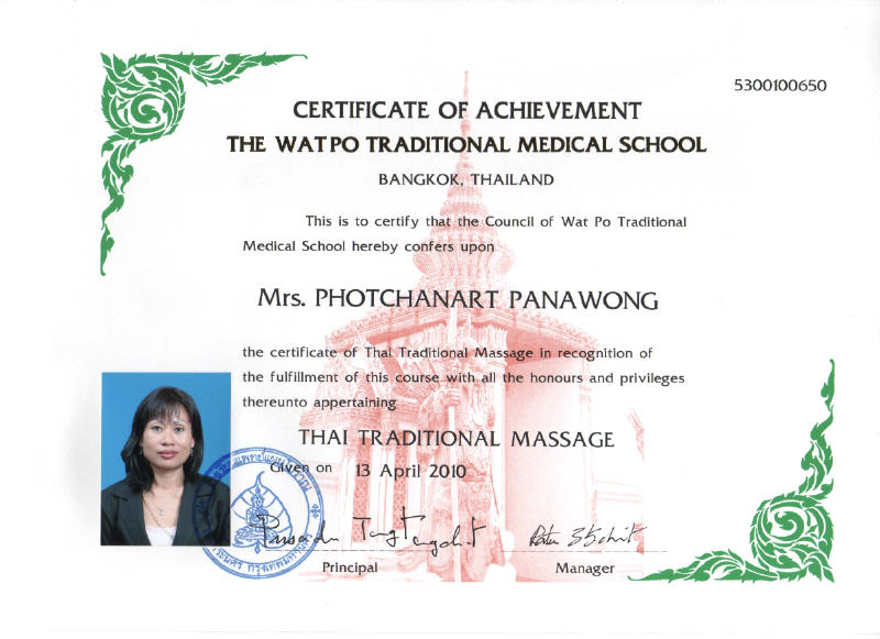 Photchanart Weinmann ist stolze Inhaberin des renommierten Wat Po Zertifikats, das eine erstklassige Ausbildung in der traditionellen thailändischen Massage bescheinigt. Dieses Zertifikat wird an Therapeuten vergeben, die die Standards der berühmten Wat Po Schule in Bangkok, Thailand, erfolgreich durchlaufen haben. Diese Schule ist eine der ältesten und angesehensten Einrichtungen für die Lehre der Thai-Massage und steht für höchste Qualität und Professionalität.